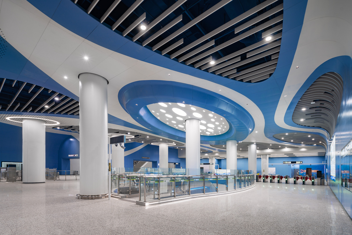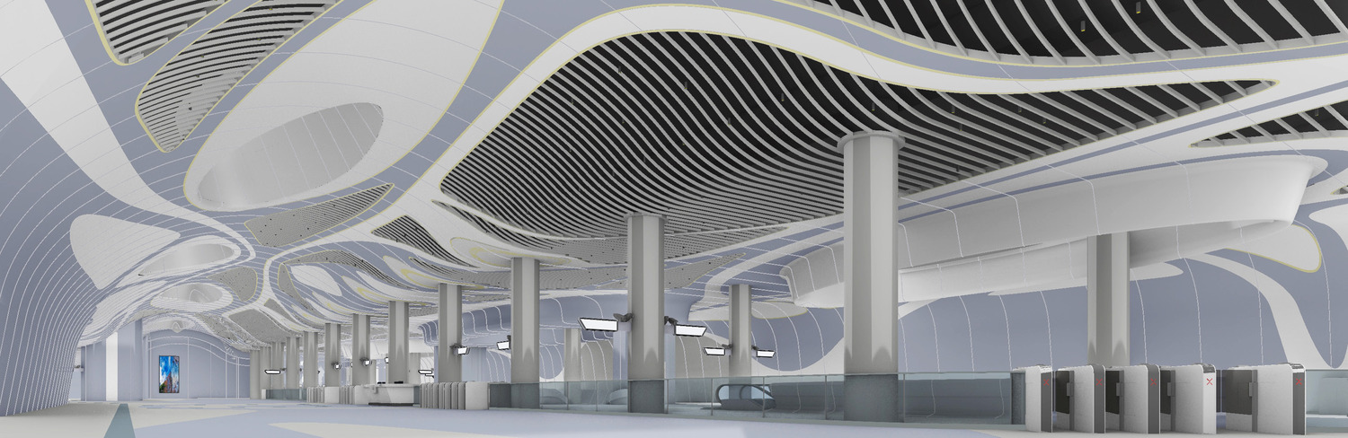 The ceiling was crafted from a curved aluminium profile that serves as a canvas for visual details, including perforations and graphic layering. Employing a single profile of single-curved aluminium throughout the main arrival hall allowed us to maintain visual fluidity while adhering to budgetary and construction requirements. By avoiding double-curved or twisted surfaces, we streamlined both the fabrication and assembly processes. Conical openings and oval skylights filter natural light into the underground station, simulating sunlight piercing the surface of the sea. Artificial lighting features, such as pebble-shaped chandeliers suspended in blue-painted voids, complement the natural elements, while ellipse-shaped LED lighting around central columns reference bubbles and ripples in seawater. Interactive marine-inspired details enhance the station's immersive experience.