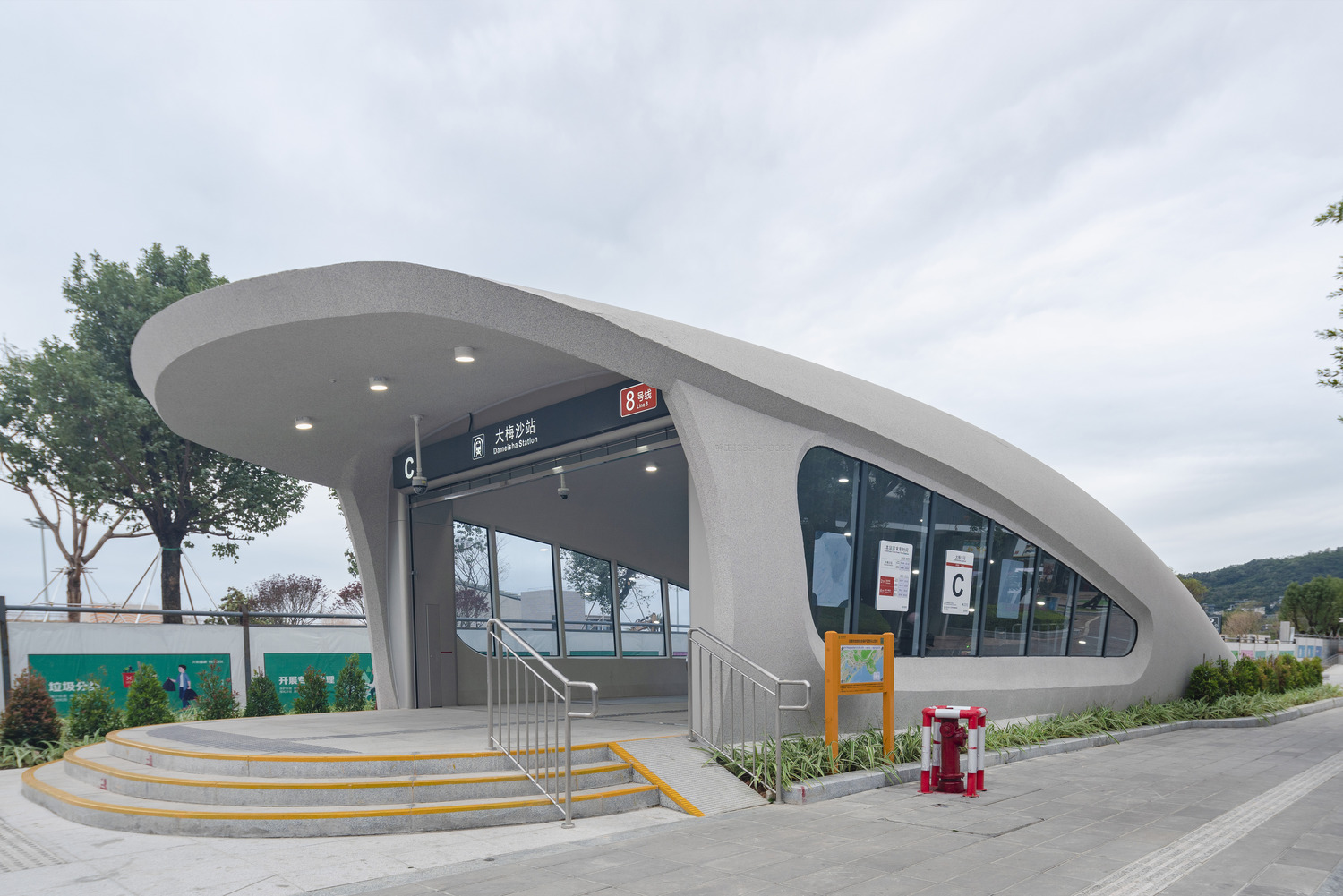 Created as part of Shenzhen's "Tourism Line", Dameisha station serves the popular Golden Coast holiday destination. Previously accessible only by car, the station now links the resort to the city's broader metro network. The station's design was informed by its beachside location and integrates elements of the surrounding topography. Rooted in the coastal scenery, the design embodies a sense of freedom, tranquillity, and unhurried comfort, aligning with the overarching tourism theme of Metro Line 8.