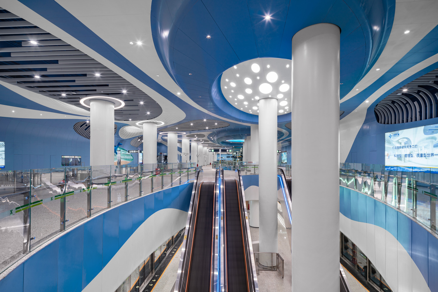 The station's two-level interior features motifs that mimic the shapes of waves and the textures, forms and hues of sand and pebbles. A palette of soft whites contrasts with aquatic blues, evoking the interplay between the shoreline and ocean. The architectural language captures the mystery and romance of the sea's infinite movements, reflections, and the dynamic shapes of waves. At the heart of its design is a fluid ceiling pattern that extends to the walls, creating the illusion of underwater movement.